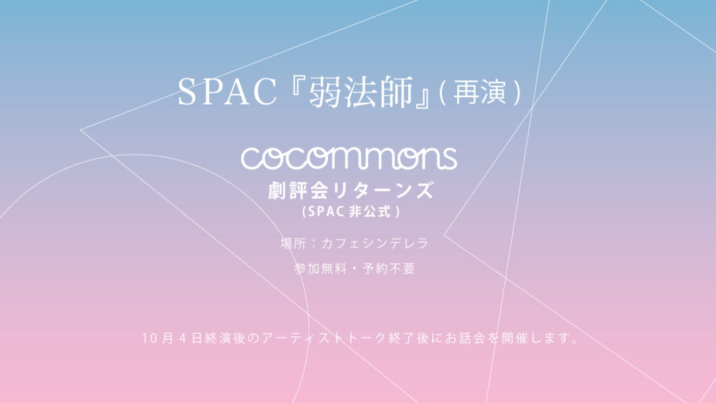 SPAC非公式イベント [お話会] 『弱法師』劇評会リターンズ in カフェシンデレラ 日時:10月4日(土)『弱法師』終演後のアーティストトーク終了後、ゆるやかに開始 場所:静岡芸術劇場 カフェシンデレラ 主催:柚木康 … 続きを読む [お話会] 『弱法師』劇評会リターンズ in カフェシンデレラ